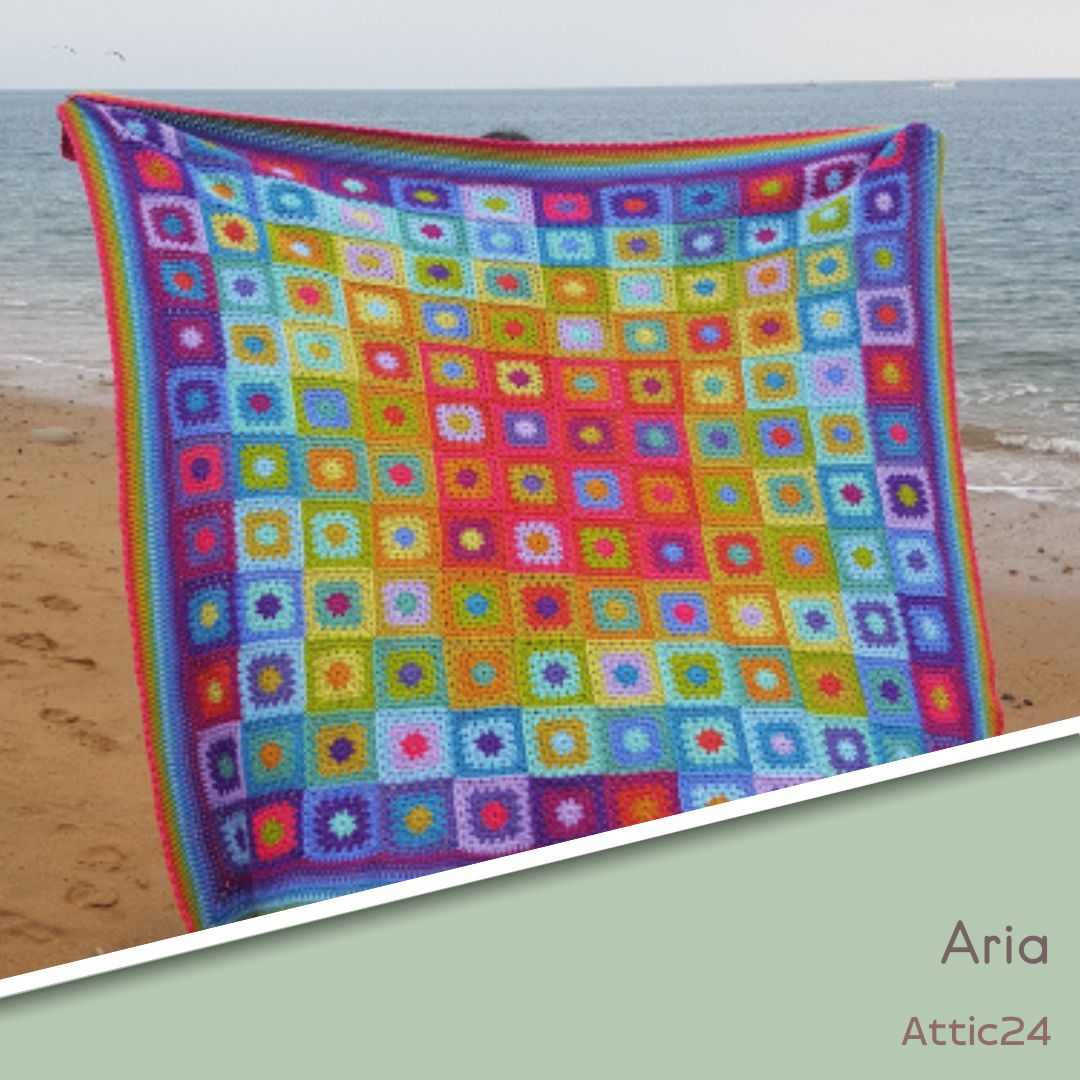 Je kunt het garenpakket bestellen bij de Wolkast: garenpakket Aria Deken.Â