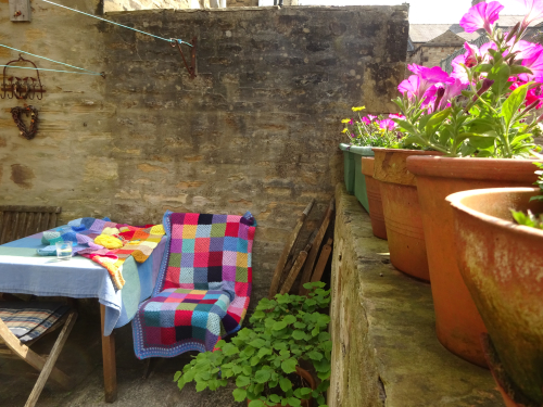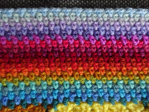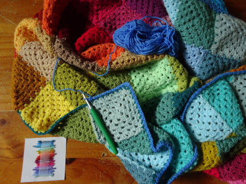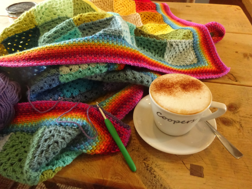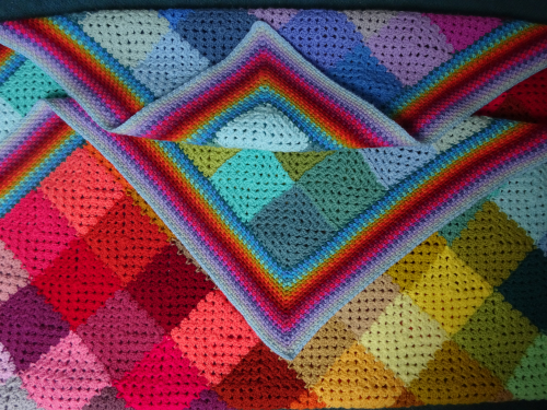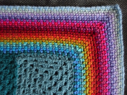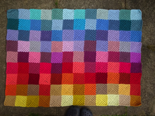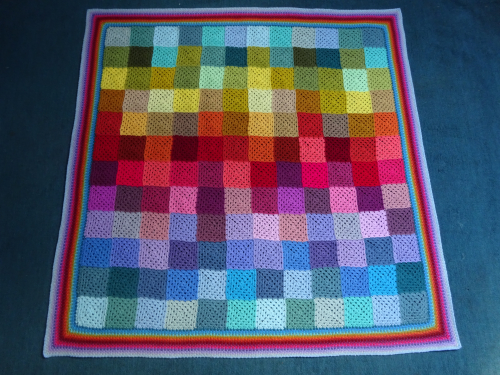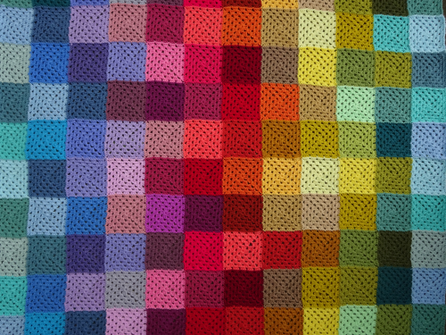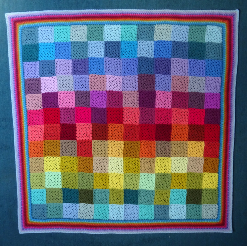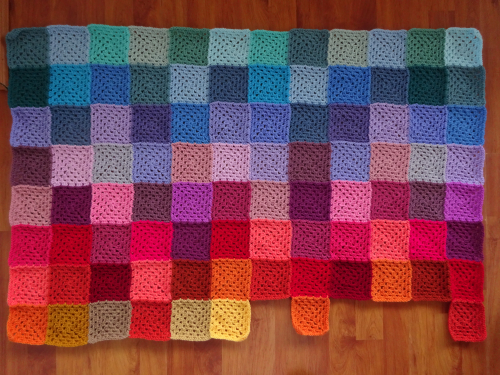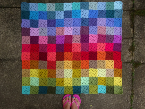 Speel je ook graag met kleuren? Deze deken, gemaakt van gewone granny squares verloopt van koude naar warme tinten en dan weer terug naar koude tinten. Het is een project wat ook voor niet zulke ervaren haaksters goed te doen is. Plunder een garenwinkel óf gebruik je resten ervoor. Door meer of minder vierkantjes te haken speel je met de afmetingen van je deken.
