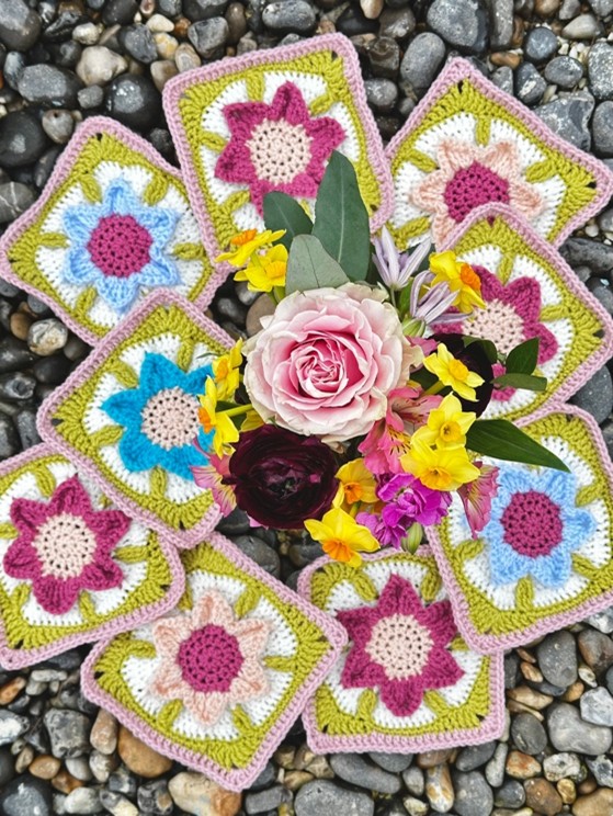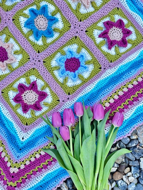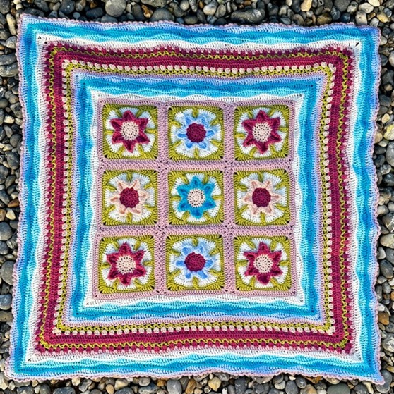 De deken heeft 9 afzonderlijke bloemvierkanten in het midden die worden samengevoegd voordat er toeren omheen worden gehaakt.