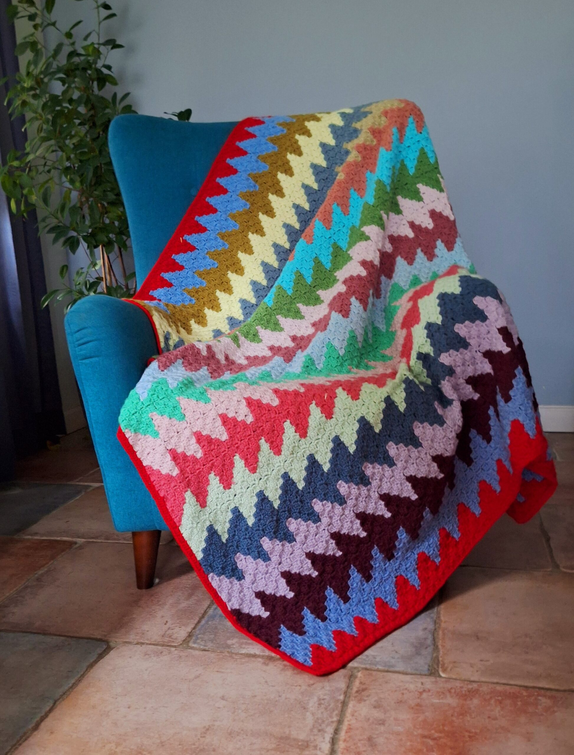 Het haakpatroon is in de join as you go corner to corner techniek gehaakt. Je hebt steeds maar twee bollen per baan aan je werk en hecht die aan het einde van de baan af. Daardoor kun je ook gemakkelijk de maat van de deken aanpassen aan je eigen wensen. De corner to corner techniek heeft normaal véél meer bollen tegelijkertijd, dus dit is echt een heerlijke variatie.